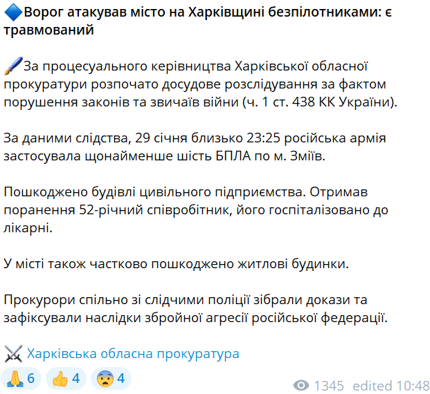 Російські військові атакували місто Зміїв Харківської області безпілотниками пізно увечері 29 січня. Внаслідок агресії РФ постраждав 52-річний чоловік, його ушпиталили.