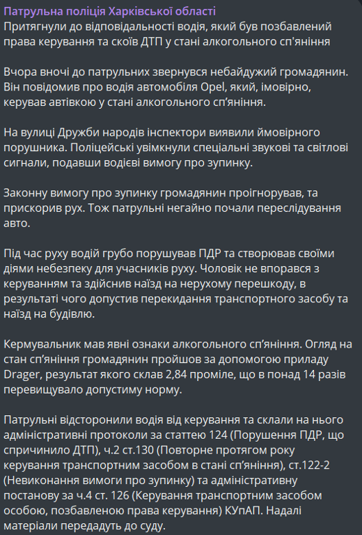 Нетрезвый водитель в ночь на 26 февраля совершил дорожно-транспортное происшествие в Харькове. До этого у него уже отобрали водительские права за поездки в состоянии алкогольного опьянения.
