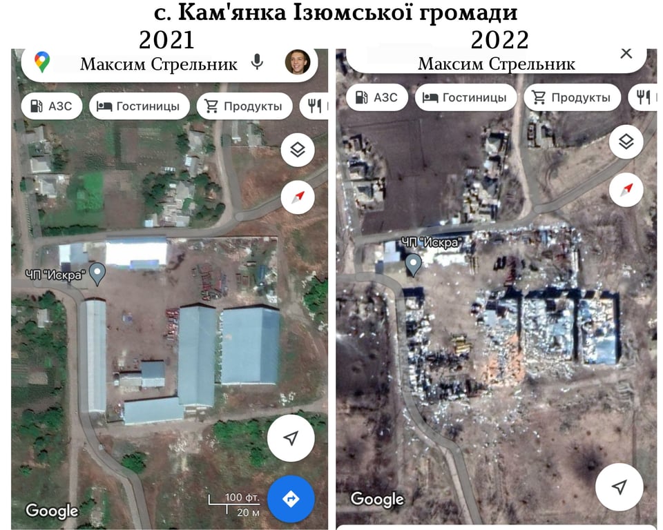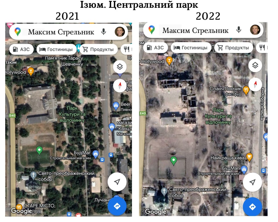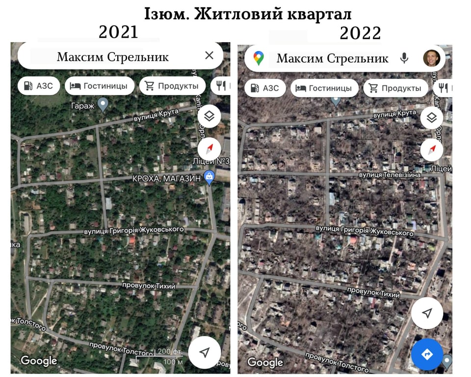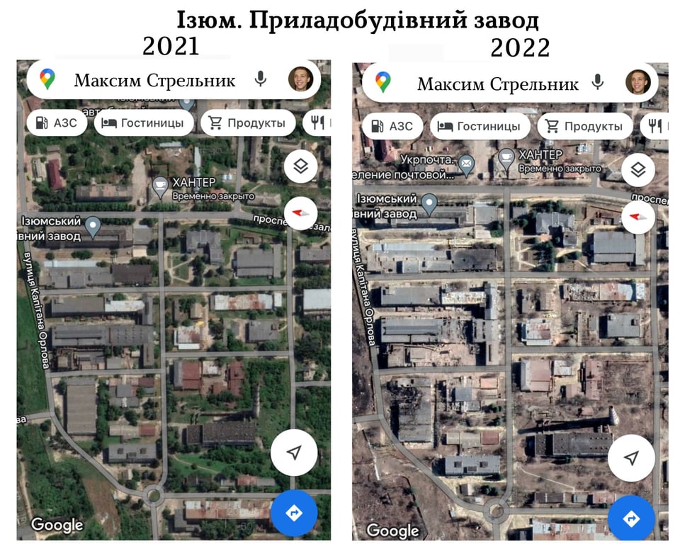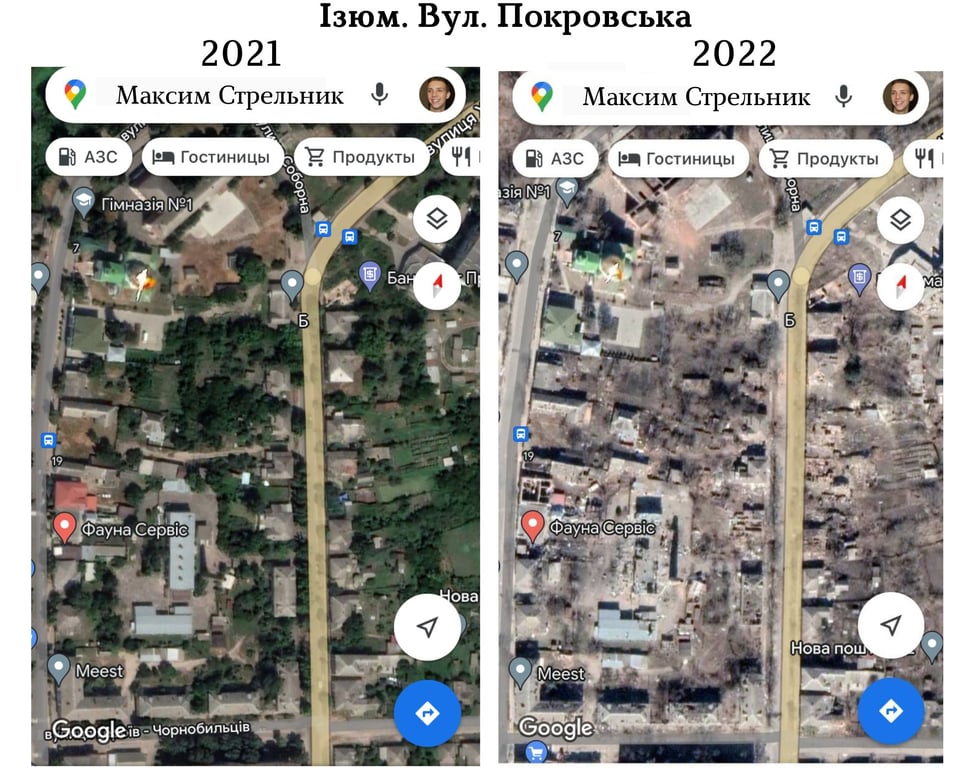 "Итак, теперь мы можем не только увидеть зловещий масштаб разрушений, вызванный российской агрессией, но и сравнить панорамы наших родных городов и сел "до и после" прихода "русского мира" в наш дом", — пишет заместитель председателя Изюмской военной администрации Максим Стрельник.