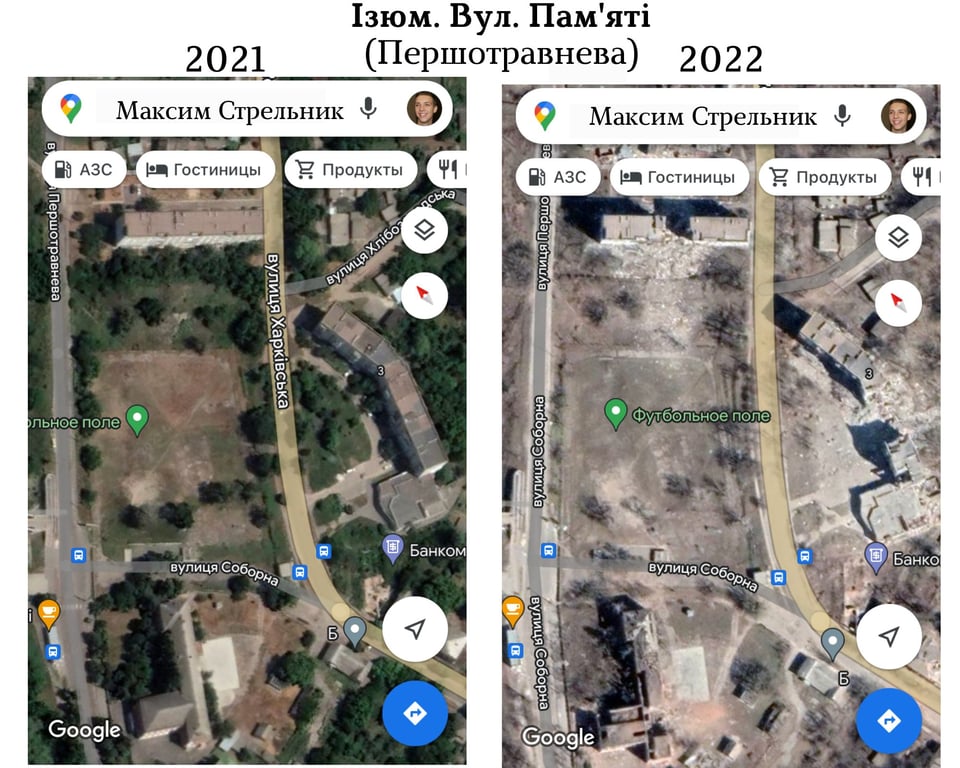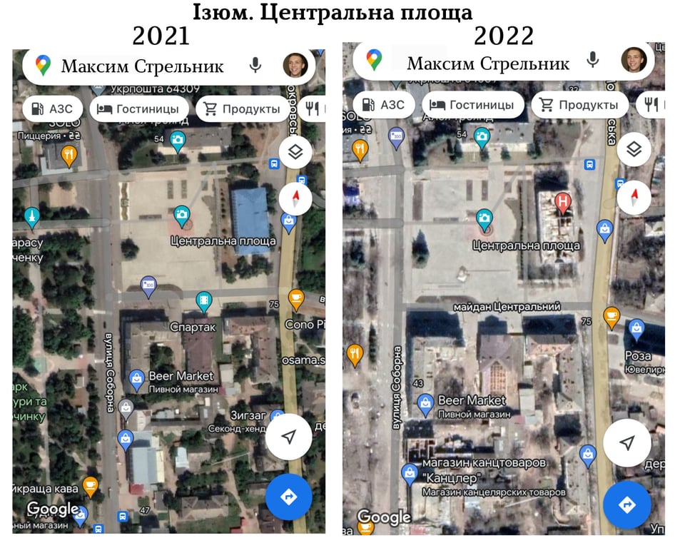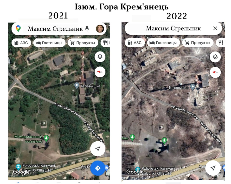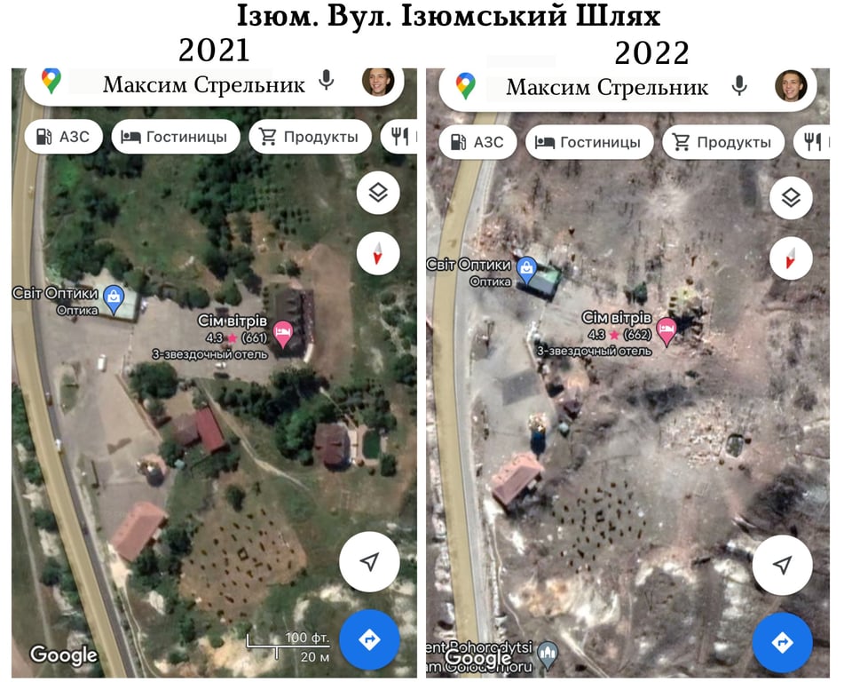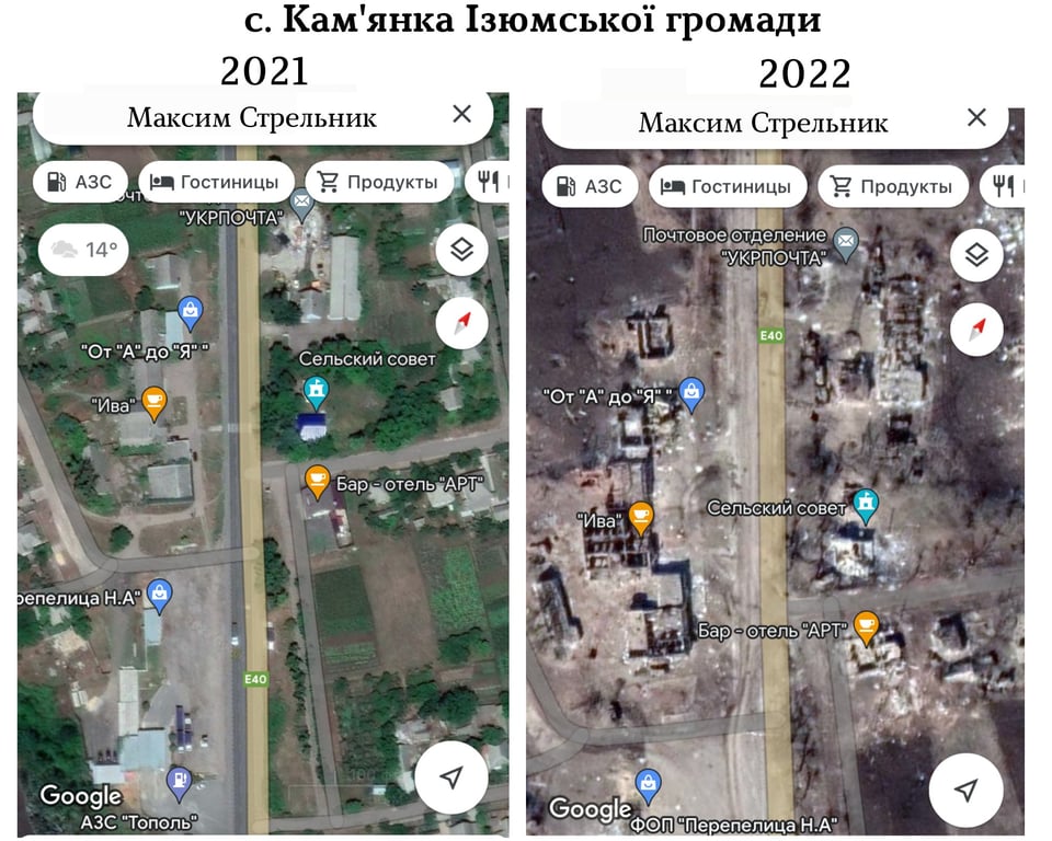 "Итак, теперь мы можем не только увидеть зловещий масштаб разрушений, вызванный российской агрессией, но и сравнить панорамы наших родных городов и сел "до и после" прихода "русского мира" в наш дом", — пишет заместитель председателя Изюмской военной администрации Максим Стрельник.