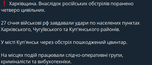Добавим, харьковские прокуроры показали последствия вражеских обстрелов Купянского района 26 и 27 января. В настоящее время начаты досудебные расследования по фактам нарушения законов и обычаев войны со стороны РФ.