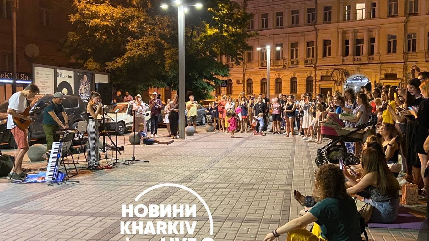Во вторник на площади перед зданием Харьковской областной филармонии на ул. Рымарская, 23 музыканты сыграли известные песни Андрея Кузьменко, которого мы все знаем, как Кузьму Скрябина. 17 августа музыканту исполнилось бы 53 года.