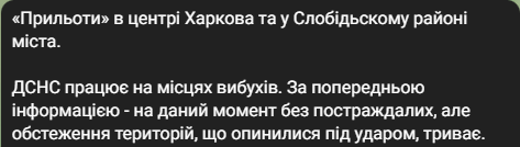 "Зафиксированы попадания в Слободском и Шевченковском районах Харькова. Предварительно — ракеты С-300. В настоящее время информации о пострадавших не поступало. Данные уточняются, профильные службы работают на местах попаданий", — также говорится в сообщении главы ОВА.