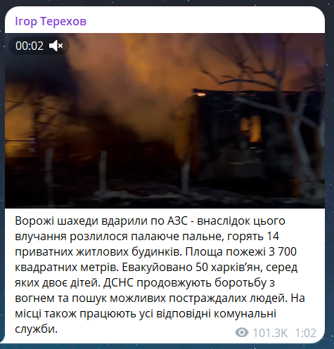 "Вражеские "шахеды" ударили по АЗС — в результате этого попадания разлилось горящее горючее, горят 14 частных жилых домов. Площадь пожара 3 700 квадратных метров", — отметил мэр Харькова.