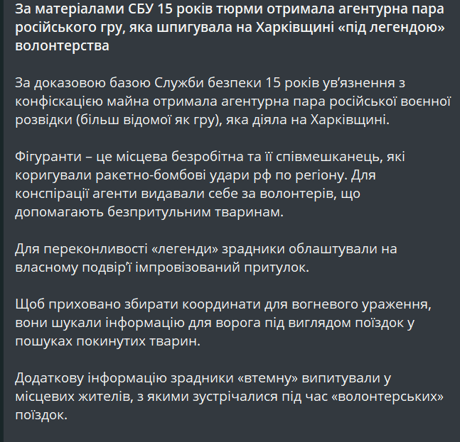 Среди осужденных — местная безработная и ее сожитель, которые передавали врагу координаты для ракетно-бомбовых ударов по Харьковщине. Чтобы замаскировать свою деятельность, супруги выдавали себя за волонтеров, которые занимаются бездомными животными.