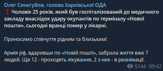 "Чоловік 25 років, який був госпіталізований до медичного закладу внаслідок удару окупантів по терміналу "Нової пошти", сьогодні вранці помер у лікарні", — розповів Синєгубов.