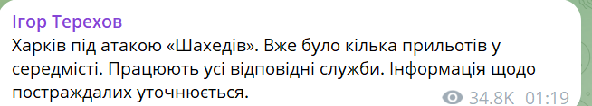 00:19. Місцева влада повідомила про атаку Харкова.