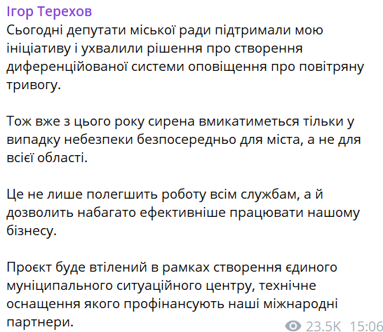 Він пояснив, що тепер сирена у місті вмикатиметься тільки у випадку безпосередньої небезпеки для Харкова, а не для всієї області.