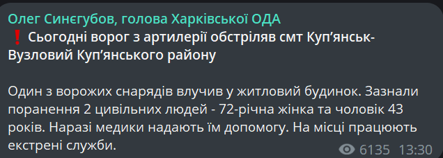 За словами Олега Синєгубова, один з ворожих снарядів влучив у житловий будинок. Зазнали поранень 2 цивільних людей — 72-річна жінка та чоловік 43 років.