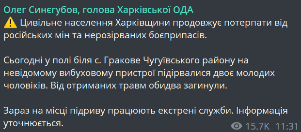 Сьогодні у полі біля с. Гракове Чугуївського району на невідомому вибуховому пристрої підірвалися двоє молодих чоловіків. Від отриманих травм обидва загинули.